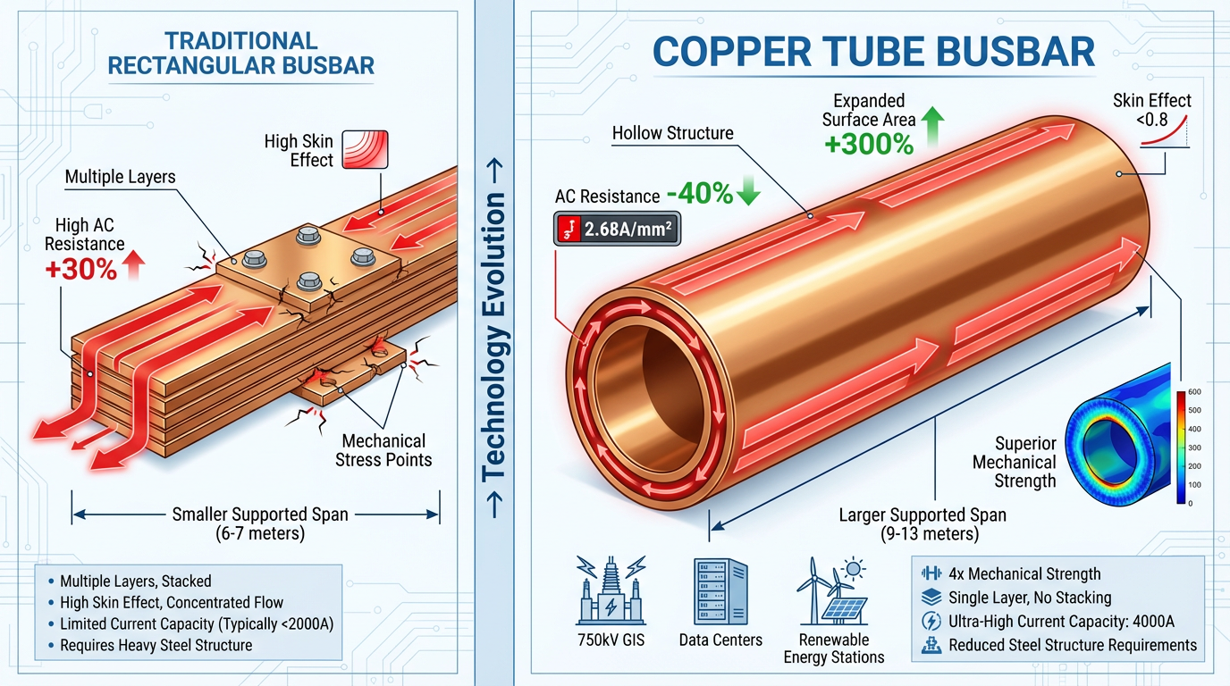 Tabella: Confronto delle prestazioni delle sbarre collettrici in tubo di rame rispetto alle sbarre collettrici rettangolari tradizionali (2025)