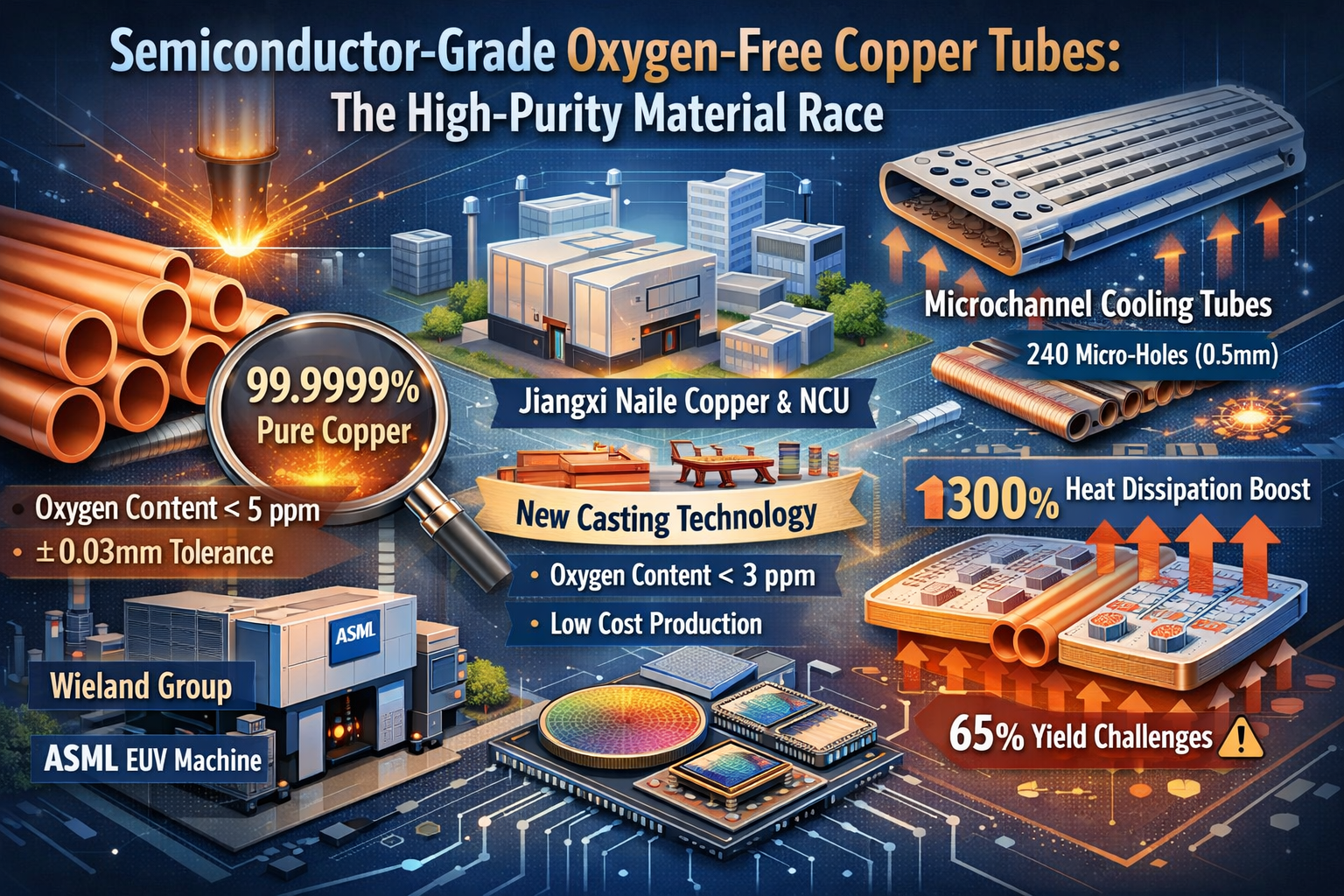 Scoperte dentro conveniente stanno emergendo delle alternative. Jiangxi Naile Copper, in collaborazione con l'Università di Nanchang, ha sviluppato un "metodo di colata continua orizzontale con divisione di ossigeno a bassissimo contenuto di ossigeno" che controlla il contenuto di ossigeno inferiore a 3 ppm a un ottavo del costo dei metodi di vuoto importati. Questa innovazione è entrata nella catena di fornitura per le linee di produzione a 14 nm di SMIC. Le applicazioni più avanzate includono tubi di raffreddamento a livello di wafer con progetti di microcanali (ad esempio, 240 microfori di 0,5 mm di diametro) per migliorare l'efficienza di dissipazione del calore del 300%, anche se i tassi di rendimento rimangono una sfida al 65%.