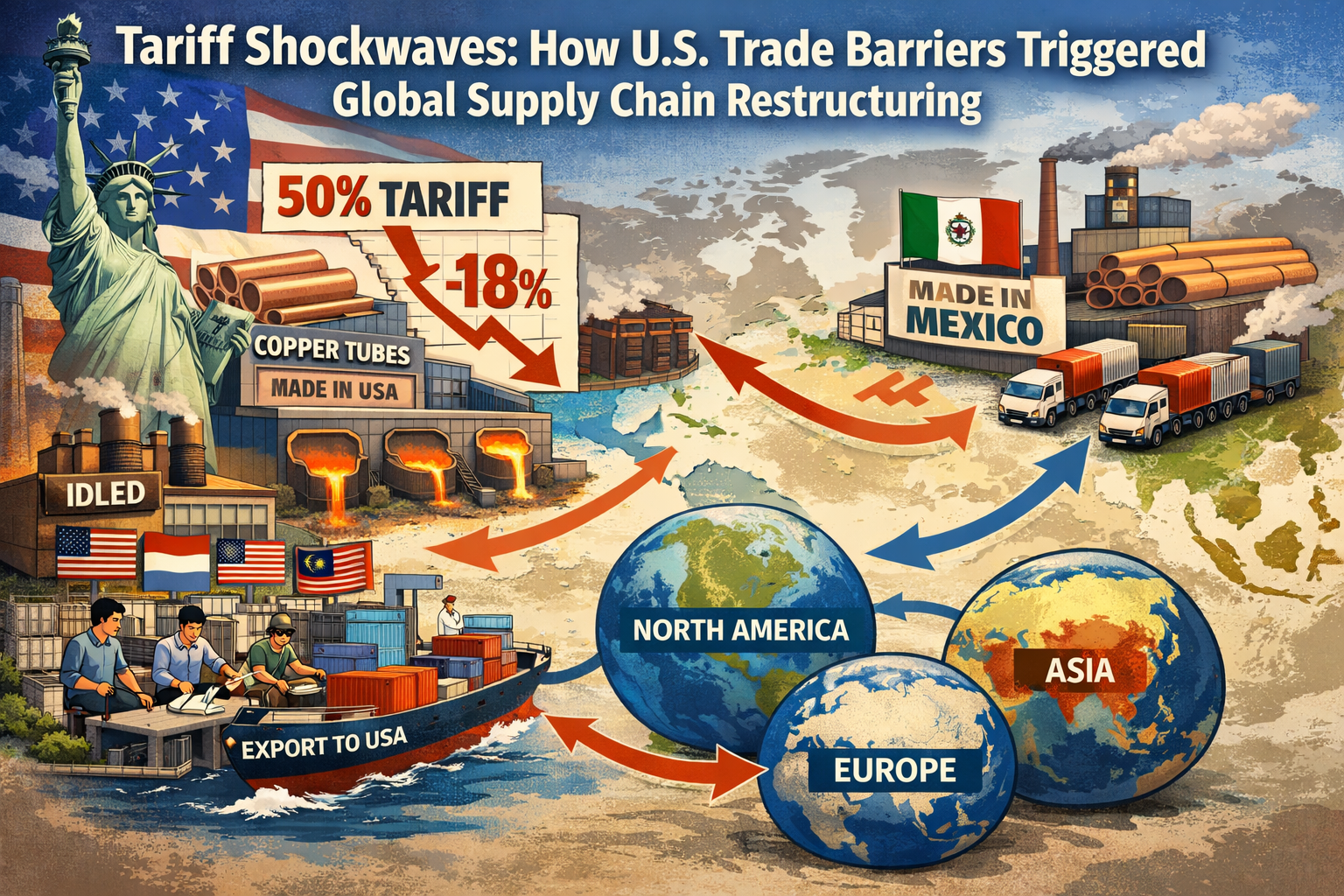 Sottotitolo: Quando gli Stati Uniti hanno imposto dazi del 50% sui tubi di rame e hanno innescato una ristrutturazione della catena commerciale globale, in che modo la capacità produttiva nel Sud-Est asiatico e in Messico è aumentata del 46,3% in un anno? Questa migrazione della catena di fornitura guidata dalle politiche sta ridisegnando la mappa globale della distribuzione del valore per i tubi di rame.