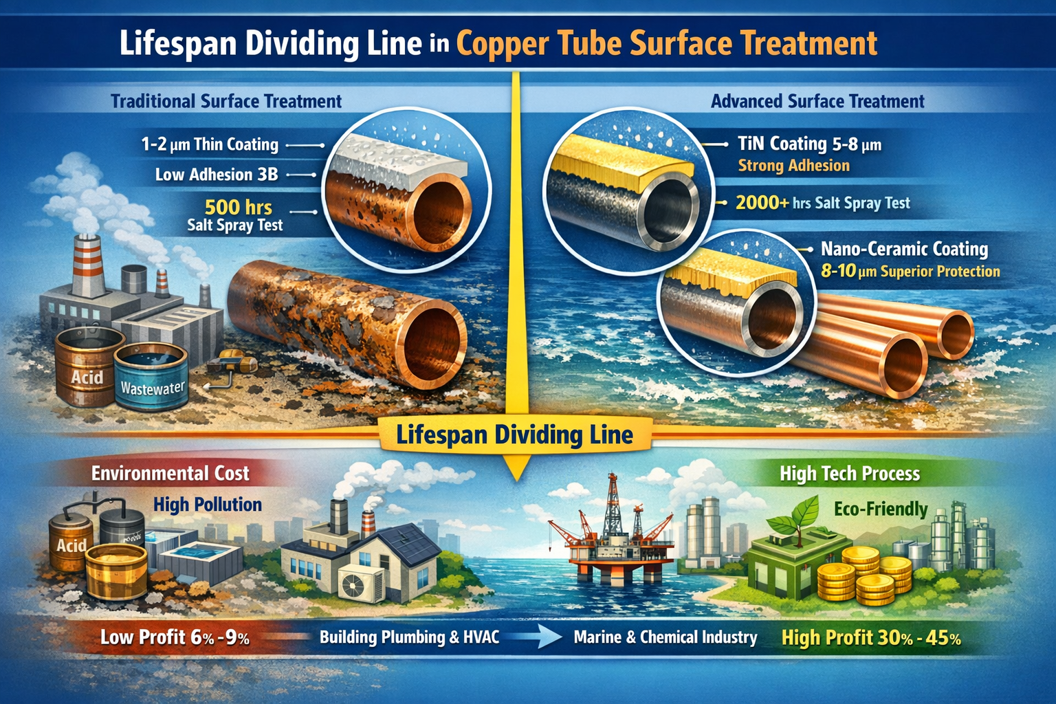 “Lo sono entrambi tubi di rame utilizzato in apparecchiature per la desalinizzazione dell'acqua di mare , ma i prodotti con cui abbiamo trattato decapaggio e passivazione convenzionali ha mostrato corrosione per vaiolatura e perdite in meno di 3 anni nell'ambiente marino; mentre il prodotto del concorrente, trattato con tecnologia di placcatura ionica sotto vuoto , ha una durata di oltre 15 anni e il suo prezzo unitario è superiore del 30% al nostro. Il signor Liu, direttore tecnico di un'azienda di tubi in lega di rame a Qingdao, ha mostrato due sezioni di tubi di rame scartati e intatti, riveleo il valore nascosto della tecnologia di trattamento superficiale. Il trattamento superficiale, come fase finale nella produzione del tubo di rame, può sembrare una semplice operazione ausiliaria di "rimozione e rivestimento della ruggine", ma determina direttamente la qualità del prodotto. resistenza alla corrosione, resistenza all'usura , e vita utile , e further impacts its market positioning and added value. Currently, most domestic copper tube manufacturers still rely on traditional surface treatment processes such as decapaggio e passivazione ordinaria , rendendo i loro prodotti inadatti ad ambienti esigenti come trattamento delle acque marine, chimiche e di fascia alta ; alcune aziende, tuttavia, hanno aggiornato i propri raffinate tecnologie di trattamento superficiale , consentendo ai loro tubi di rame di mantenere prestazioni stabili in ambienti estremi e conquistare facilmente il mercato di fascia alta. Questo sottile " pellicola protettiva " sta diventando un dettaglio fondamentale che differenzia la competitività dei prodotti in tubi di rame e rappresenta anche la chiave per il passaggio del settore da "qualificato" a "di alta qualità".
