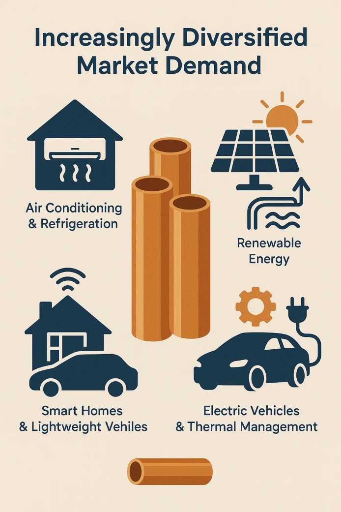 Con lo sviluppo accelerato di case intelligenti, veicoli leggeri ed elettrificazione, si stanno anche espandendo gli scenari di applicazione dei tubi di rame. I tubi di rame ad alte prestazioni non sono solo componenti di base per condensatori ed evaporatori negli elettrodomestici, ma svolgono anche un ruolo cruciale nei sistemi di gestione termica dei nuovi veicoli energetici. Si prevede che questo mercato continuerà a crescere.