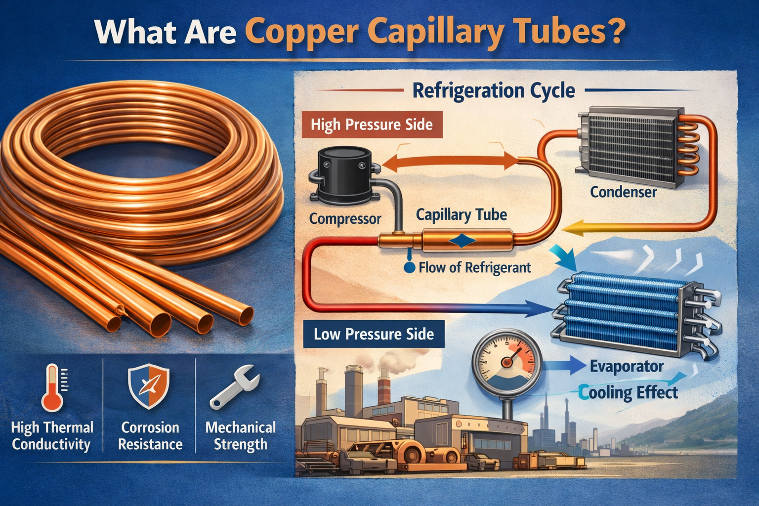 A tubo capillare è un tubo piccolo e stretto che funge da componente critico nei sistemi di refrigerazione, soprattutto negli valvola di espansione sezione del ciclo frigorifero. Il tubo funziona controlleo il flusso del refrigerante dal lato ad alta pressione al lato a bassa pressione del sistema. Riducendo la pressione del refrigerante mentre scorre attraverso il tubo, il refrigerante si espee e si raffredda, il che è una parte vitale del processo di raffreddamento.