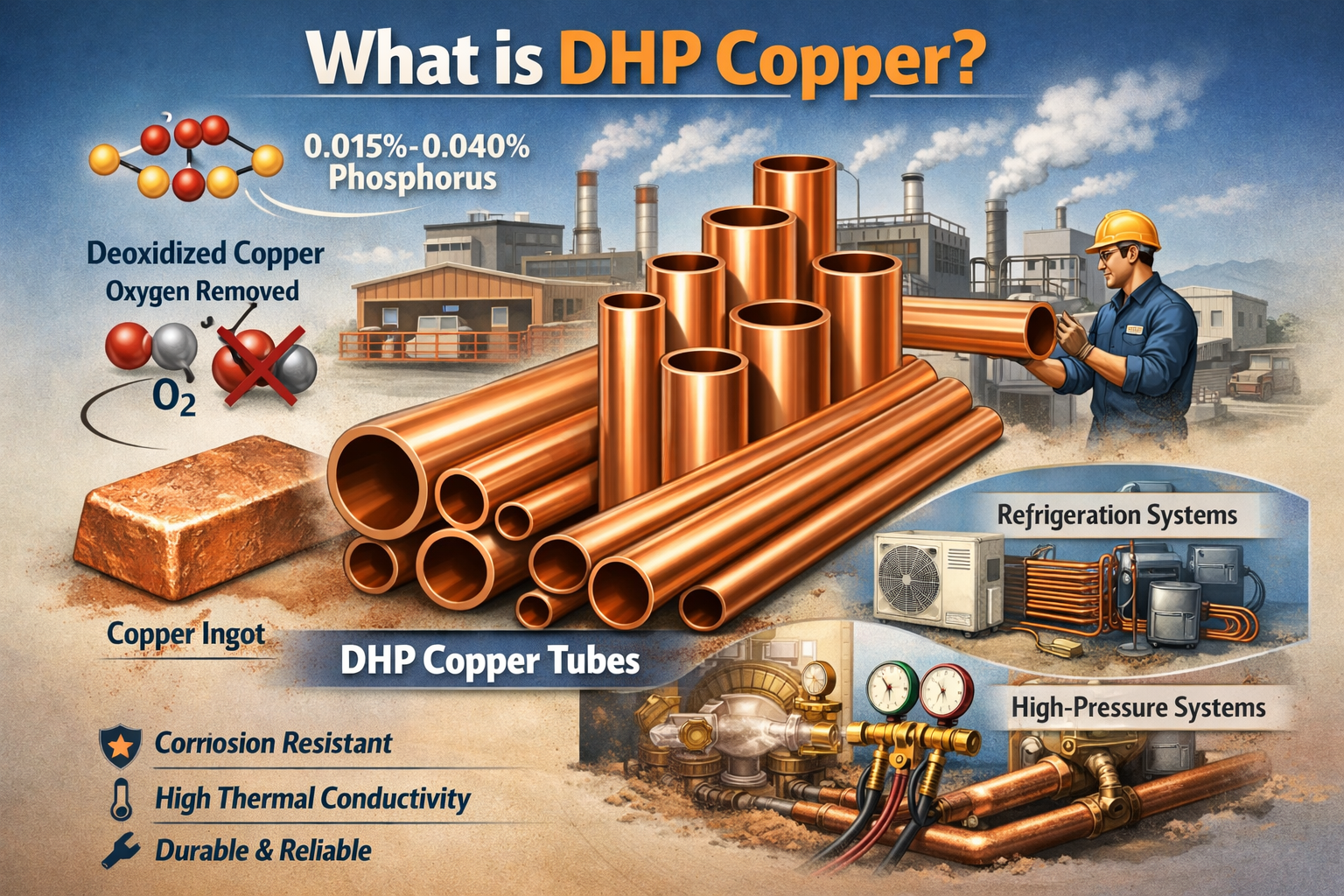 Rame DHP è di alta qualità, rame disossidato lega che contiene una piccola quantità di fosforo , tipicamente tra lo 0,015% e lo 0,040%. La caratteristica principale di questo rame è che è stato trattato per eliminsono l'ossigeno, processo che ne migliora la resistenza alla corrosioneeeee e garantisce migliori prestazioni nei sistemi ad alta pressione. Il contenuto di fosforo ne migliora ulteriormente le proprietà, rendendolo ideale per l'uso in applicazioni in cui durata, conduttività termica e resistenza sono fondamentali.